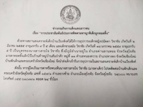 รายละเอียด : ข่าวกรมกิจการเด็กและเยาวชน เรื่อง การประชาสัมพันธ์ประกาศติดตามหาญาติเด็กถูกทอดทิ้ง หากผู้ใดเป็นมารดาหรือพบเห็นนางสาวสายใจ วิชาชัย (มารดาเด็ก) โปรดติดต่อบ้านพักเด็กและครอบครัวจังหวัดสุโขทัย 055-610791 ตลอด 24 ชั่วโมง