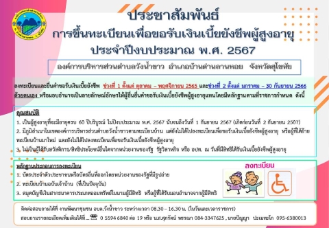ประชาสัมพันธุ์เชิญชวนผู้ที่จะมีอายุครบ 60 ปีบริบูรณ์ในปีงบประมาณ พ.ศ. 2567 มาขึ้นทะเบียนเพื่อรับเบี้ยยังชีพผู้สูงอายุ