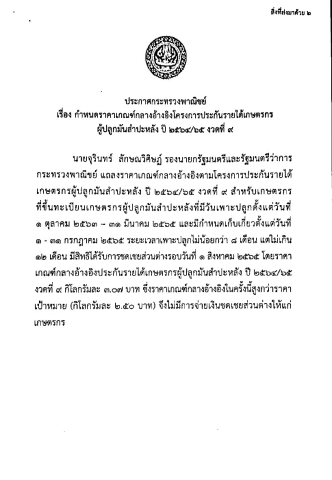 กำหนดราคาเกณฑ์กลางอ้างอิงโครงการประกันรายได้เกษตรกร ผู้ปลูกมันสำปะหลัง ปี2565/65 งวดที่9