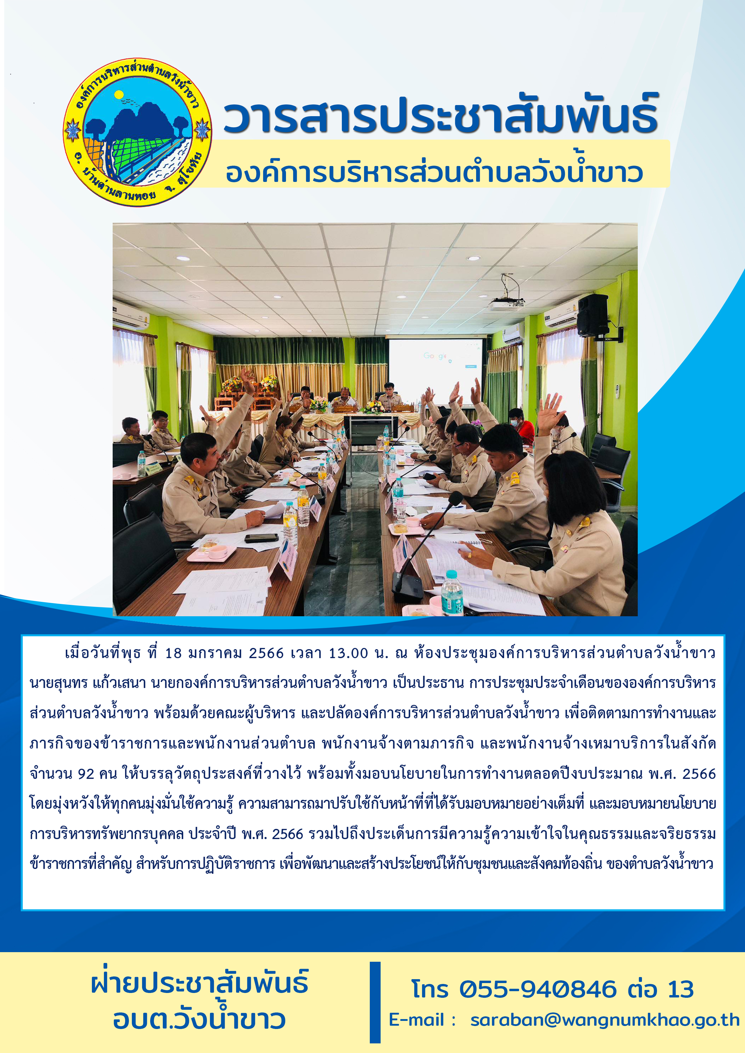 รายละเอียด : เมื่อวันที่พุธ ที่ 18 มกราคม 2566 เวลา 13.00 น. ณ ห้องประชุมองค์การบริหารส่วนตำบลวังน้ำขาว นายสุนทร แก้วเสนา นายกองค์การบริหารส่วนตำบลวังน้ำขาว เป็นประธาน การประชุมประจำเดือนขององค์การบริหารส่วนตำบลวังน้ำขาว พร้อมด้วยคณะผู้บริหาร และปลัดองค์การบริหารส่วนตำบลวังน้ำขาว เพื่อติดตามการทำงานและภารกิจของข้าราชการและพนักงานส่วนตำบล พนักงานจ้างตามภารกิจ และพนักงานจ้างเหมาบริการในสังกัด จำนวน 92 คน ให้บรรลุวัตถุประสงค์ที่วางไว้ พร้อมทั้งมอบนโยบายในการทำงานตลอดปีงบประมาณ พ.ศ. 2566 โดยมุ่งหวังให้ทุกคนมุ่งมั่นใช้ความรู้ ความสามารถมาปรับใช้กับหน้าที่ที่ได้รับมอบหมายอย่างเต็มที่ และมอบหมายนโยบายการบริหารทรัพยากรบุคคล ประจำปี พ.ศ. 2566 รวมไปถึงประเด็นการมีความรู้ความเข้าใจในคุณธรรมและจริยธรรมข้าราชการที่สำคัญ สำหรับการปฏิบัติราชการ เพื่อพัฒนาและสร้างประโยชน์ให้กับชุมชนและสังคมท้องถิ่น ของตำบลวังน้ำขาว