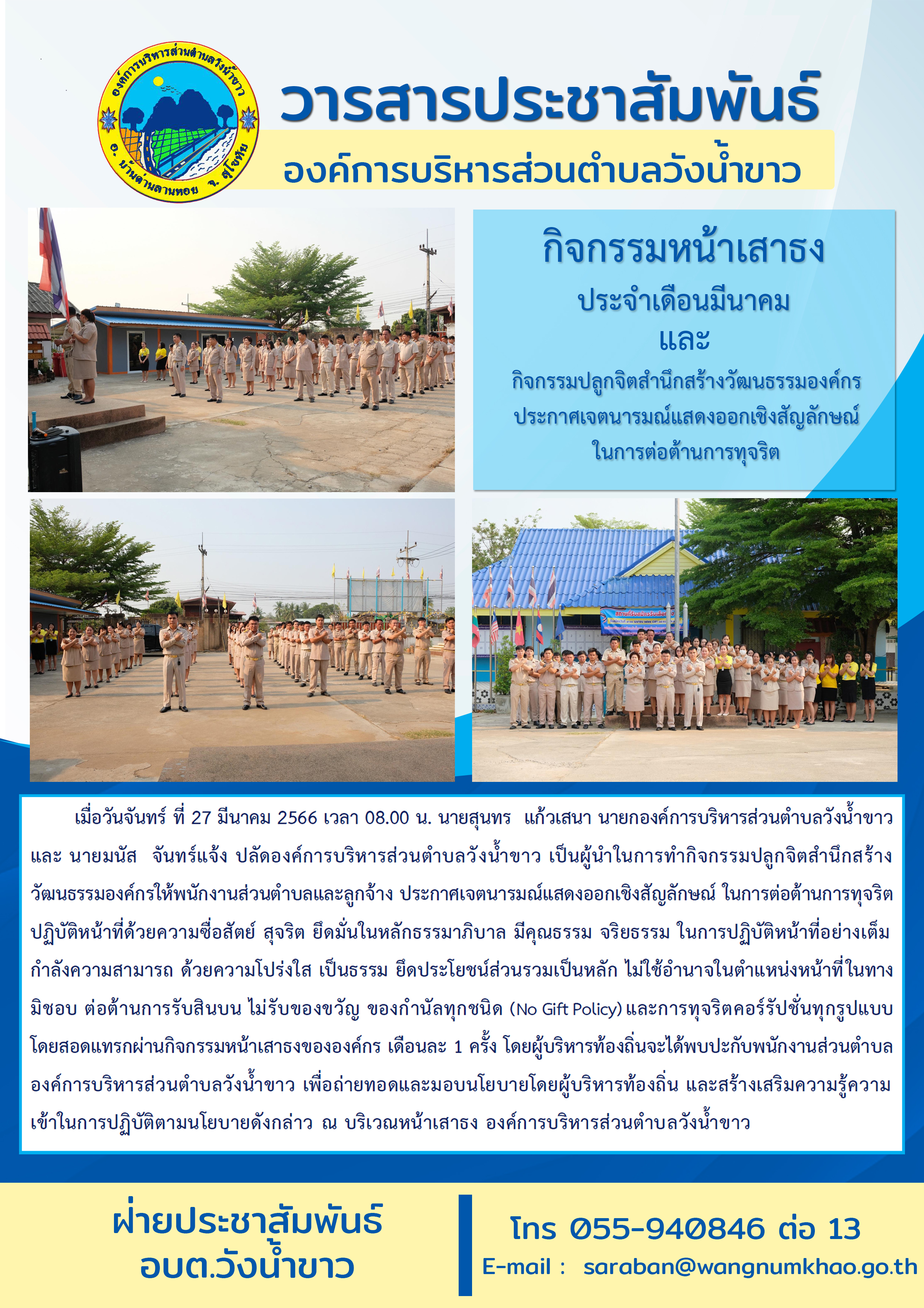 รายละเอียด : เมื่อวันจันทร์ ที่ 27 มีนาคม 2566 เวลา 08.00 น. นายสุนทร แก้วเสนา นายกองค์การบริหารส่วนตำบลวังน้ำขาว และ นายมนัส จันทร์แจ้ง ปลัดองค์การบริหารส่วนตำบลวังน้ำขาว เป็นผู้นำในการทำกิจกรรมปลูกจิตสำนึกสร้างวัฒนธรรมองค์กรให้พนักงานส่วนตำบลและลูกจ้าง ประกาศเจตนารมณ์แสดงออกเชิงสัญลักษณ์ ในการต่อต้านการทุจริต ปฏิบัติหน้าที่ด้วยความซื่อสัตย์ สุจริต ยึดมั่นในหลักธรรมาภิบาล มีคุณธรรม จริยธรรม ในการปฏิบัติหน้าที่อย่างเต็มกำลังความสามารถ ด้วยความโปร่งใส เป็นธรรม ยึดประโยชน์ส่วนรวมเป็นหลัก ไม่ใช้อำนาจในตำแหน่งหน้าที่ในทาง