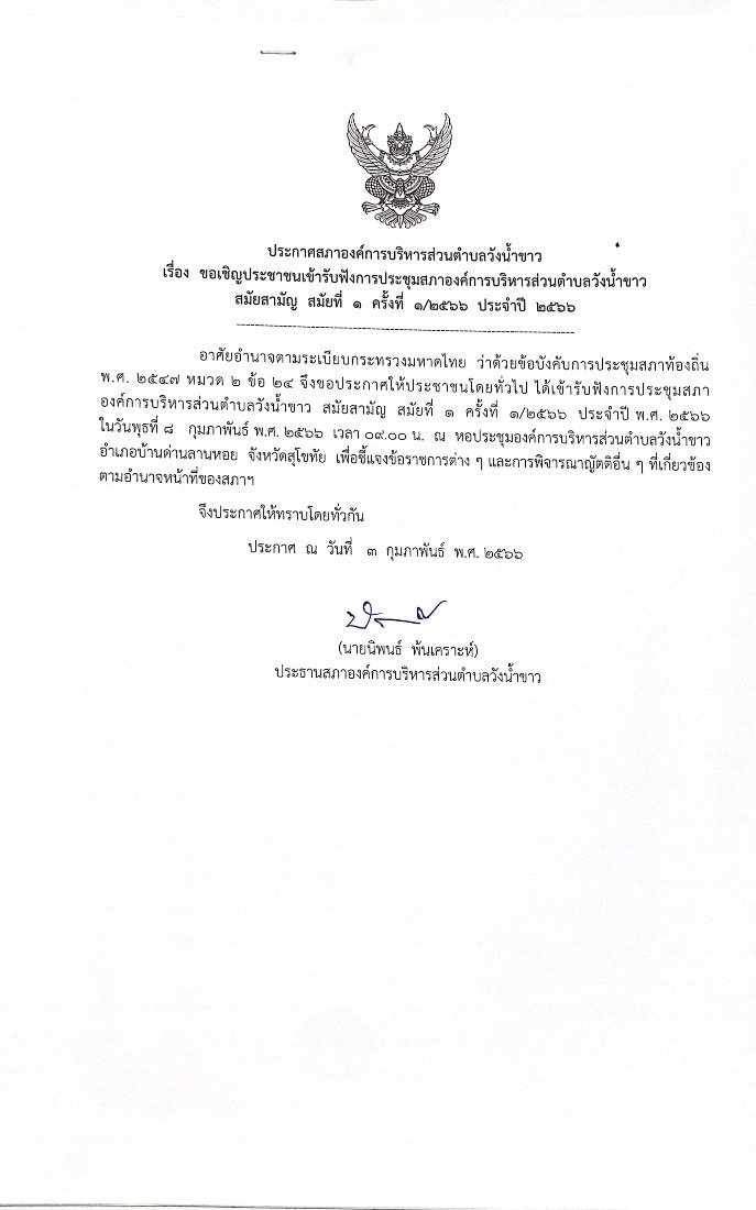 ประกาศ เรื่อง ขอเชิญประชาชนเข้ารับฟังการประชุมสภาอบต.วังน้ำขาว สมัยวิสามัญ สมัยที่ 1 ครั้งที่ 1/2566
