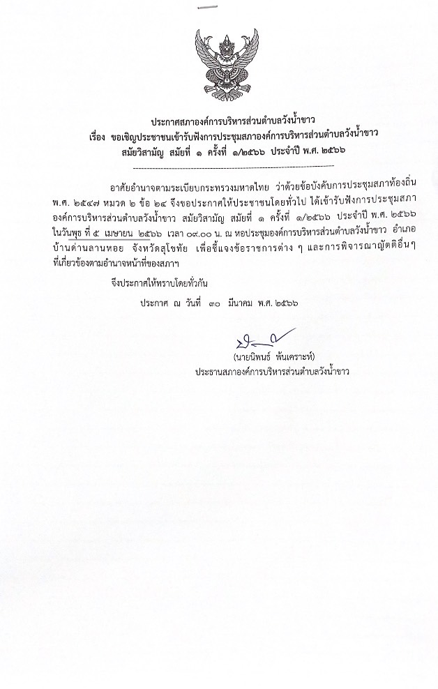 ประกาศ เรื่อง ขอเชิญประชาชนเข้ารับฟังการประชุมสภาอบต.วังน้ำขาว สมัยวิสามัญ สมัยที่ 1 ครั้งที่ 1/2566
