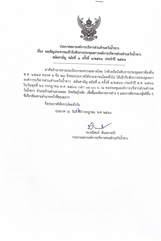 ประกาศ เรื่อง ขอเชิญประชาชนเข้ารับฟังการประชุมสภาอบต.วังน้ำขาว สมัยสามัญ สมัยที่ 3 ครั้งที่ 1/2566