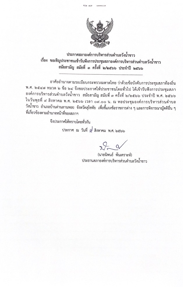 ประกาศ เรื่อง ขอเชิญประชาชนเข้ารับฟังการประชุมสภาอบต.วังน้ำขาว สมัยสามัญ สมัยที่ 3 ครั้งที่ 2/2566