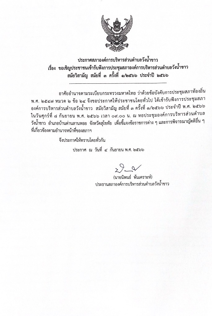 ประกาศ เรื่อง ขอเชิญประชาชนเข้ารับฟังการประชุมสภาอบต.วังน้ำขาว สมัยวิสามัญ สมัยที่ 2 ครั้งที่ 1/2566