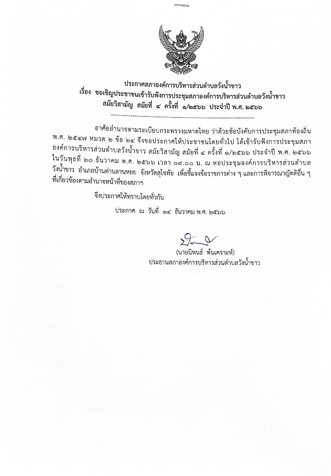 ประกาศ เรื่อง ขอเชิญประชาชนเข้ารับฟังการประชุมสภาอบต.วังน้ำขาว สมัยวิสามัญ สมัยที่ 4 ครั้งที่ 1/2566