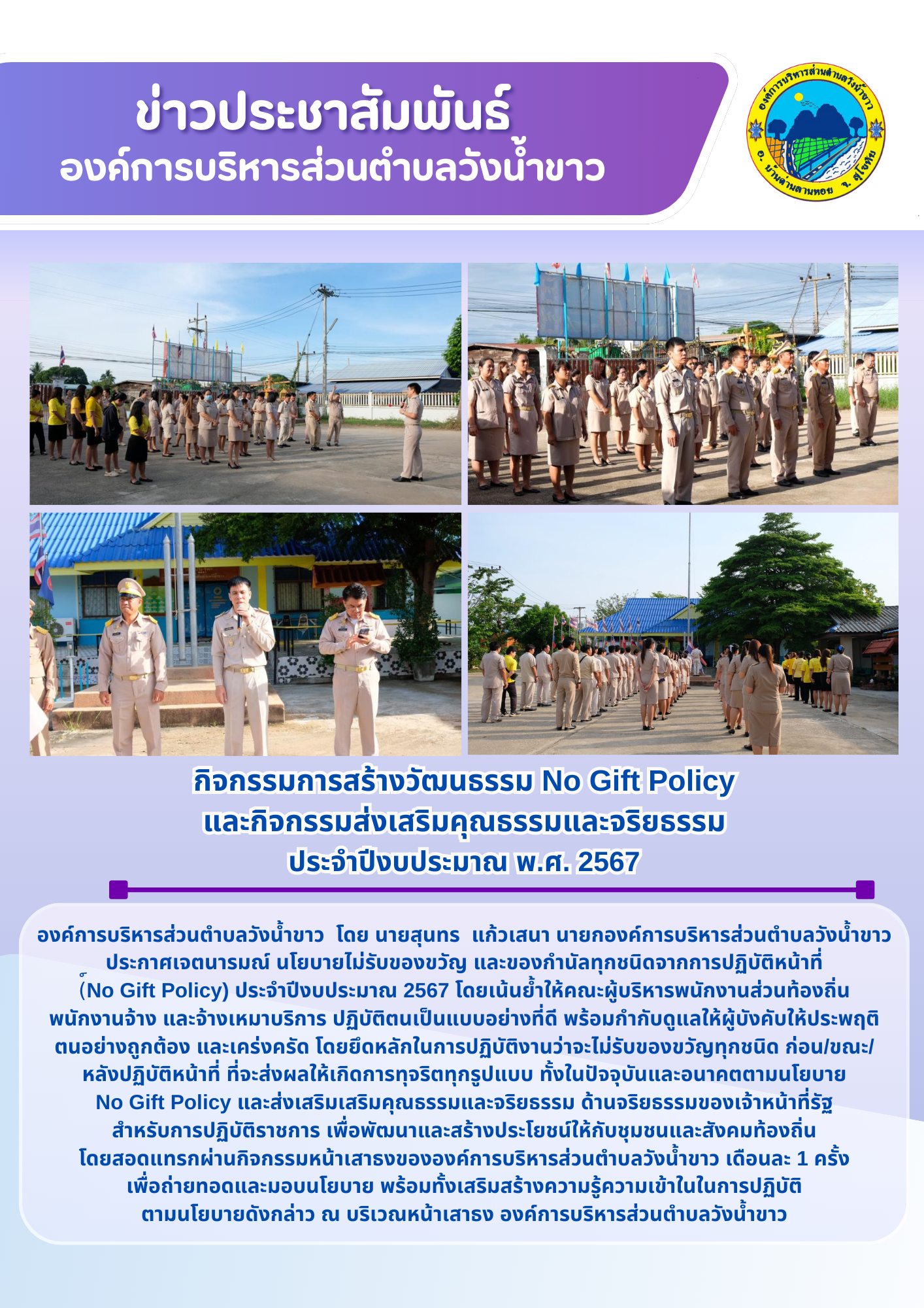 กิจกรรมเสริมสร้าง/ส่งเสริมจริยธรรมของหน่วยงาน องค์การบริหารส่วนตำบลวังน้ำขาว ปีงบประมาณ พ.ศ. 2567