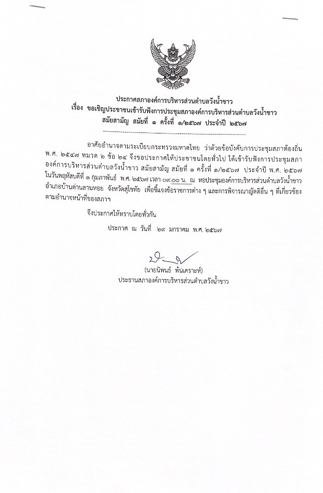ประกาศ เรื่อง ขอเชิญประชาชนเข้ารับฟังการประชุมสภาอบต.วังน้ำขาว สมัยสามัญ สมัยที่ 1 ครั้งที่ 1/2567