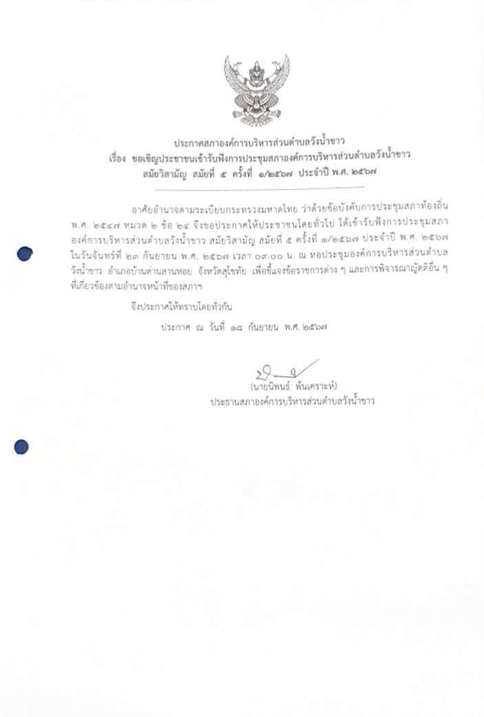 ประกาศ เรื่อง ขอเชิญประชาชนเข้ารับฟังการประชุมสภาอบต.วังน้ำขาว สมัยวิสามัญ สมัยที่ 5 ครั้งที่ 1/2567