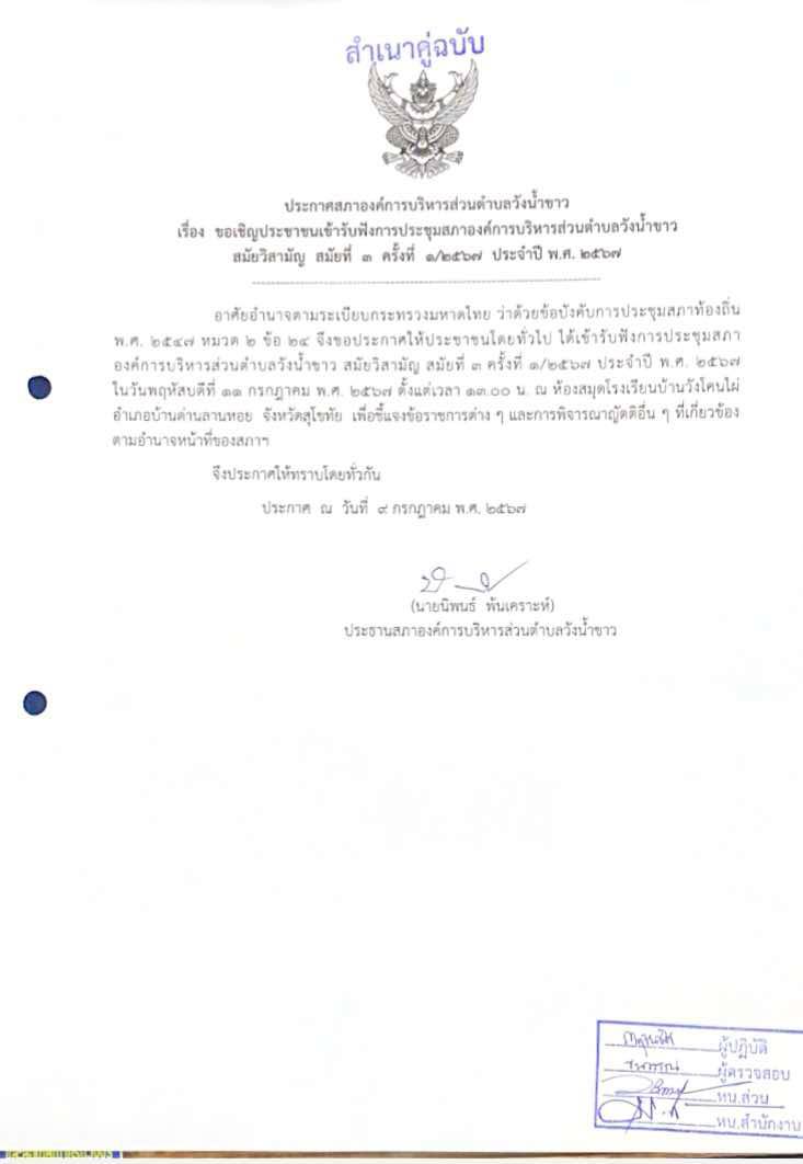 ประกาศ เรื่อง ขอเชิญประชาชนเข้ารับฟังการประชุมสภาอบต.วังน้ำขาว สมัยวิสามัญ สมัยที่ 3 ครั้งที่ 1/2567