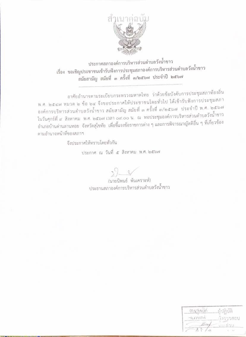 ประกาศ เรื่อง ขอเชิญประชาชนเข้ารับฟังการประชุมสภาอบต.วังน้ำขาว สมัยสามัญ สมัยที่ 3 ครั้งที่ 3/2567